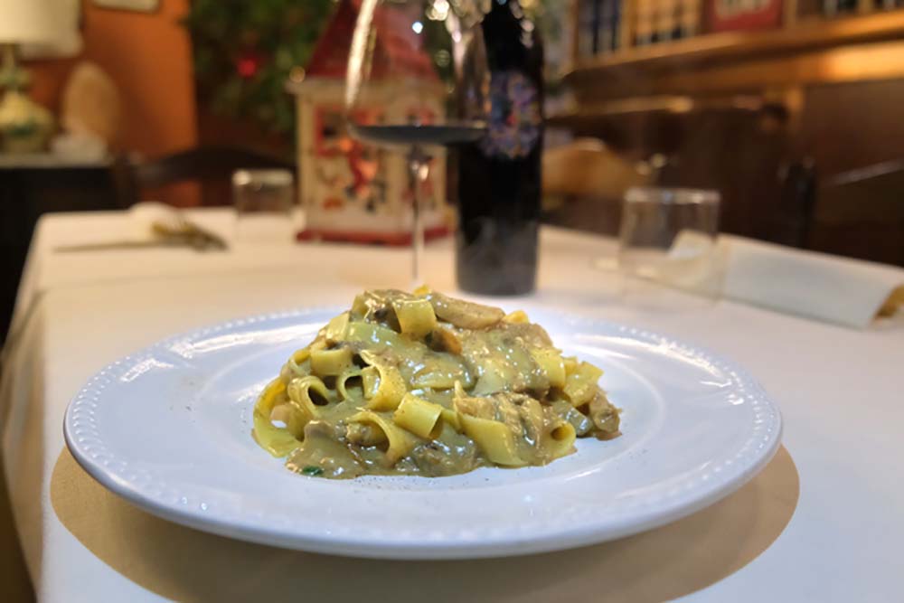 Maccheroncini (short egg pasta) stir-fried with farm meat ragù (fresh goose and duck meat braised in Sangiovese wine) (Gluten, lactose, egg) € 16.00